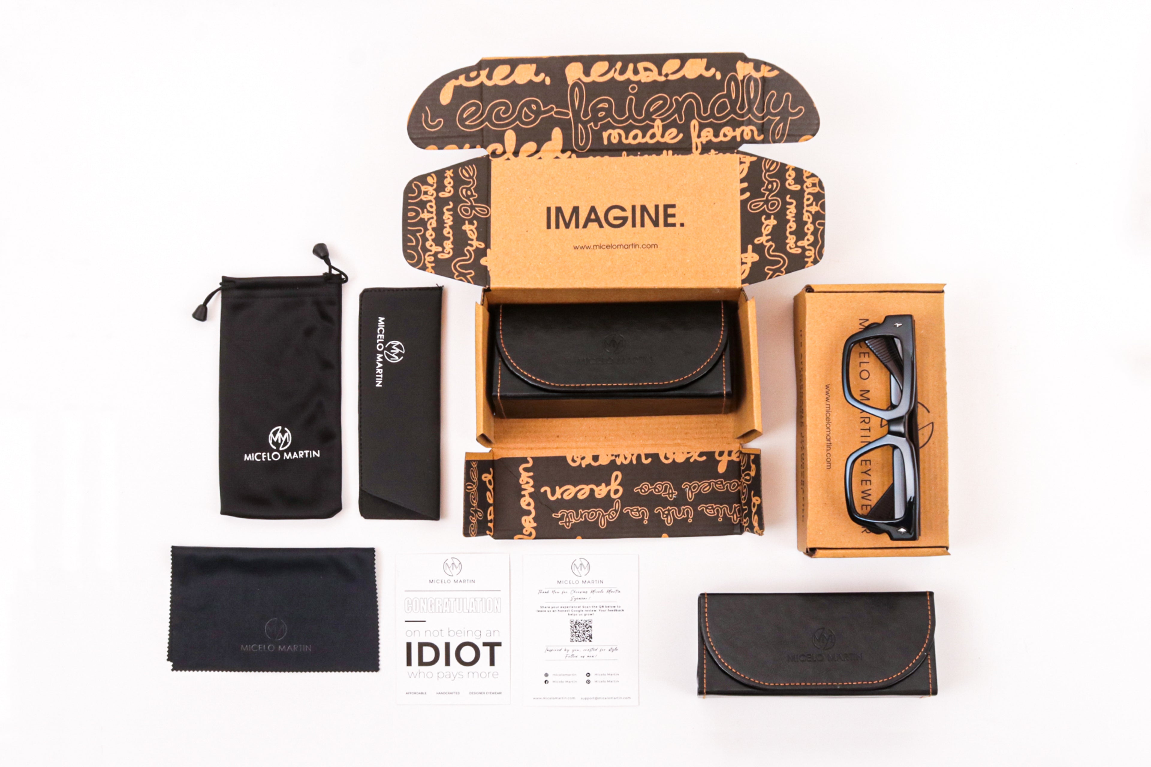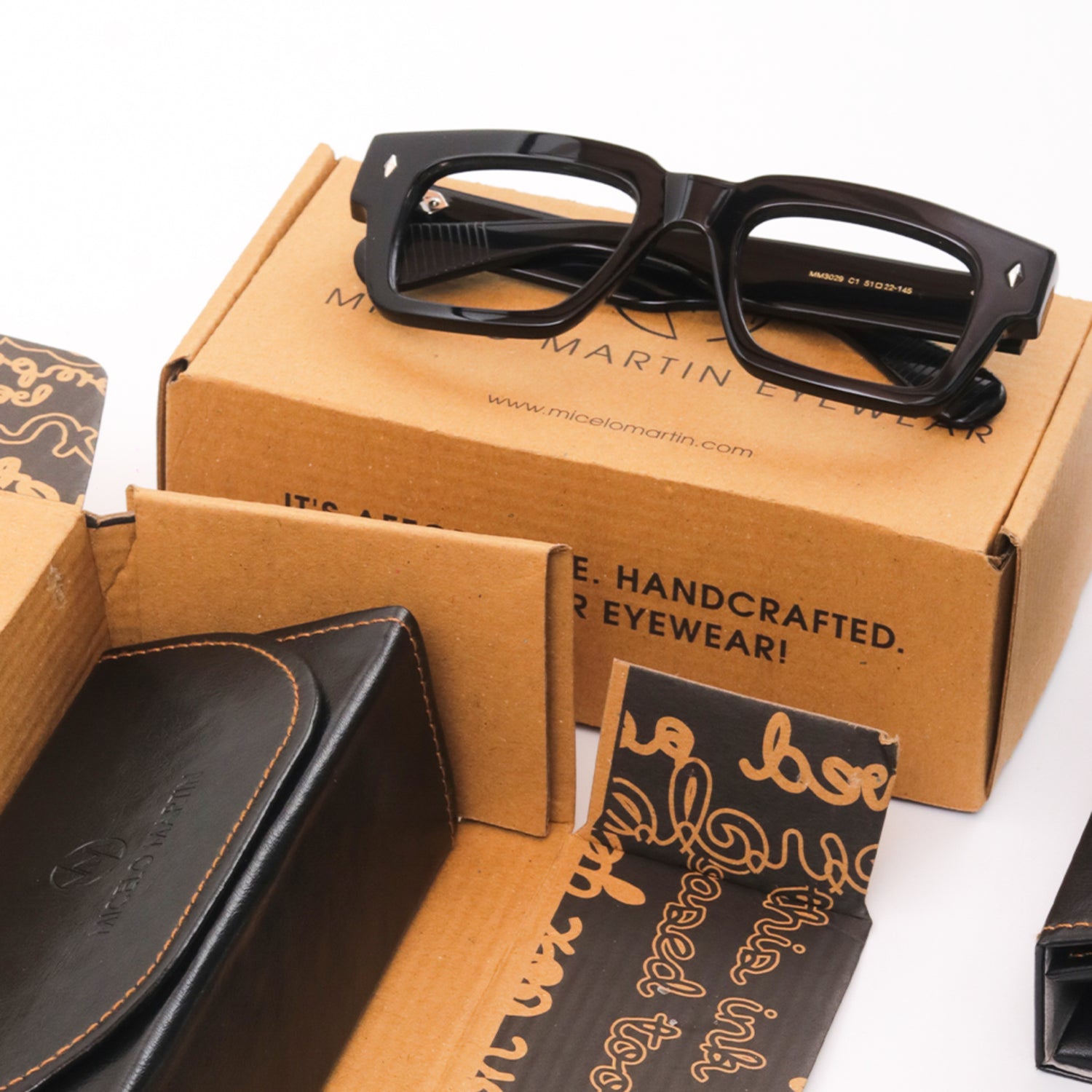 Our eyewear comes in PU leather cases, an ethical and sustainable alternative to pure leather, ensuring both durability and cruelty-free choices. Every package is carefully wrapped using biodegradable padding and recycled cardboard, ensuring your eyewear arrives safely while aligning with our sustainable practices.
